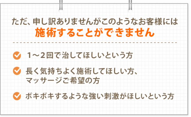 施術はボキボキしない、お子様や90歳の方でも受けて頂ける施術法なのでご安心ください。