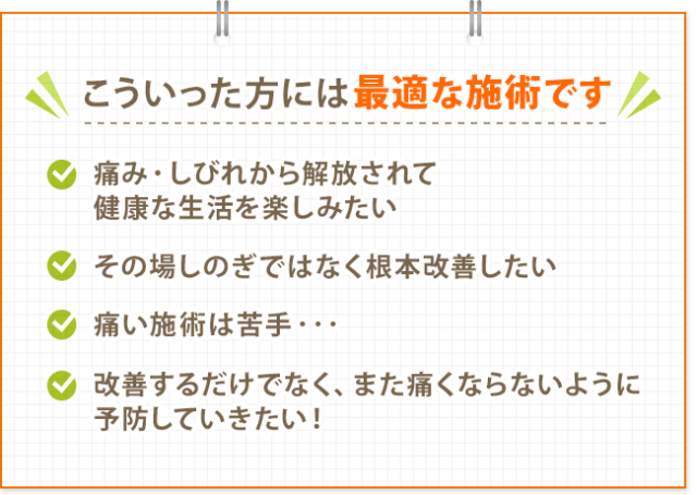 そこで当院では、「コリ・痛み」が起きている場所に対するアプローチだけではなく、関節のねじれを整えることで、根本原因から不調を改善に導きます。